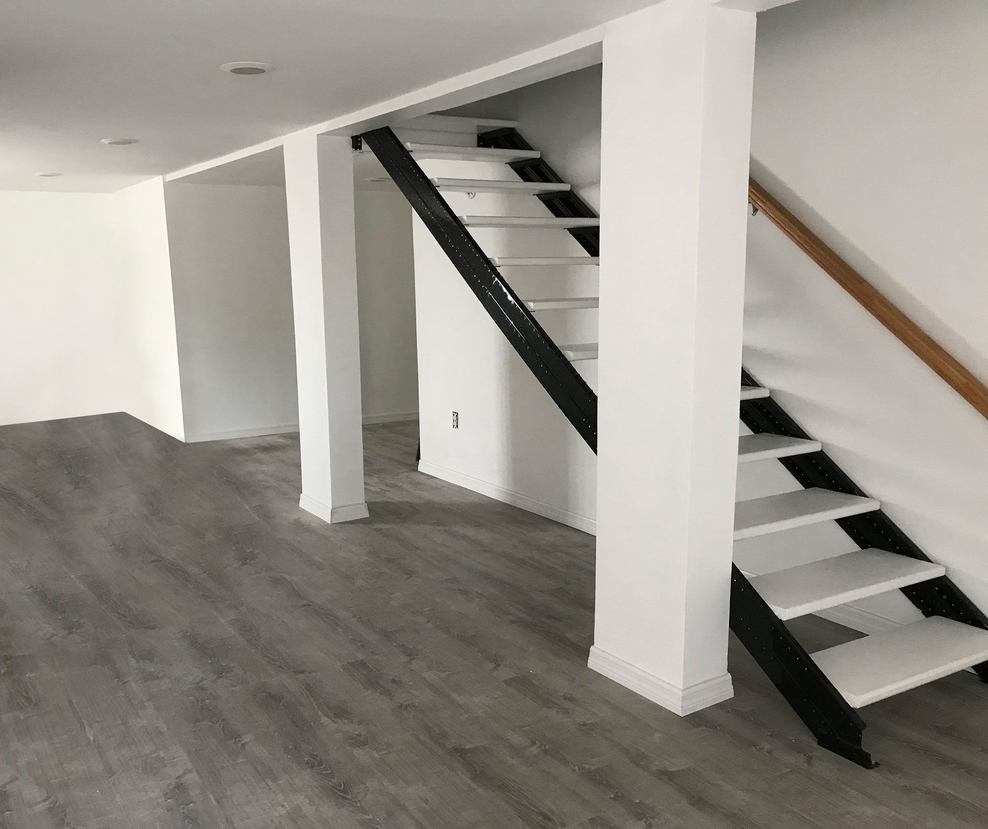 I had always hated how the ugly wood staircase imposed itself on the space. I had my revenge by ripping the wood stringers out and replacing it with a steel stringers kit ordered online. There is more space, the lines are cleaner and the oak treads will look great after a few coats of finish. I'm very satisfied. Enjoy. - A. Cammer, Kentucky